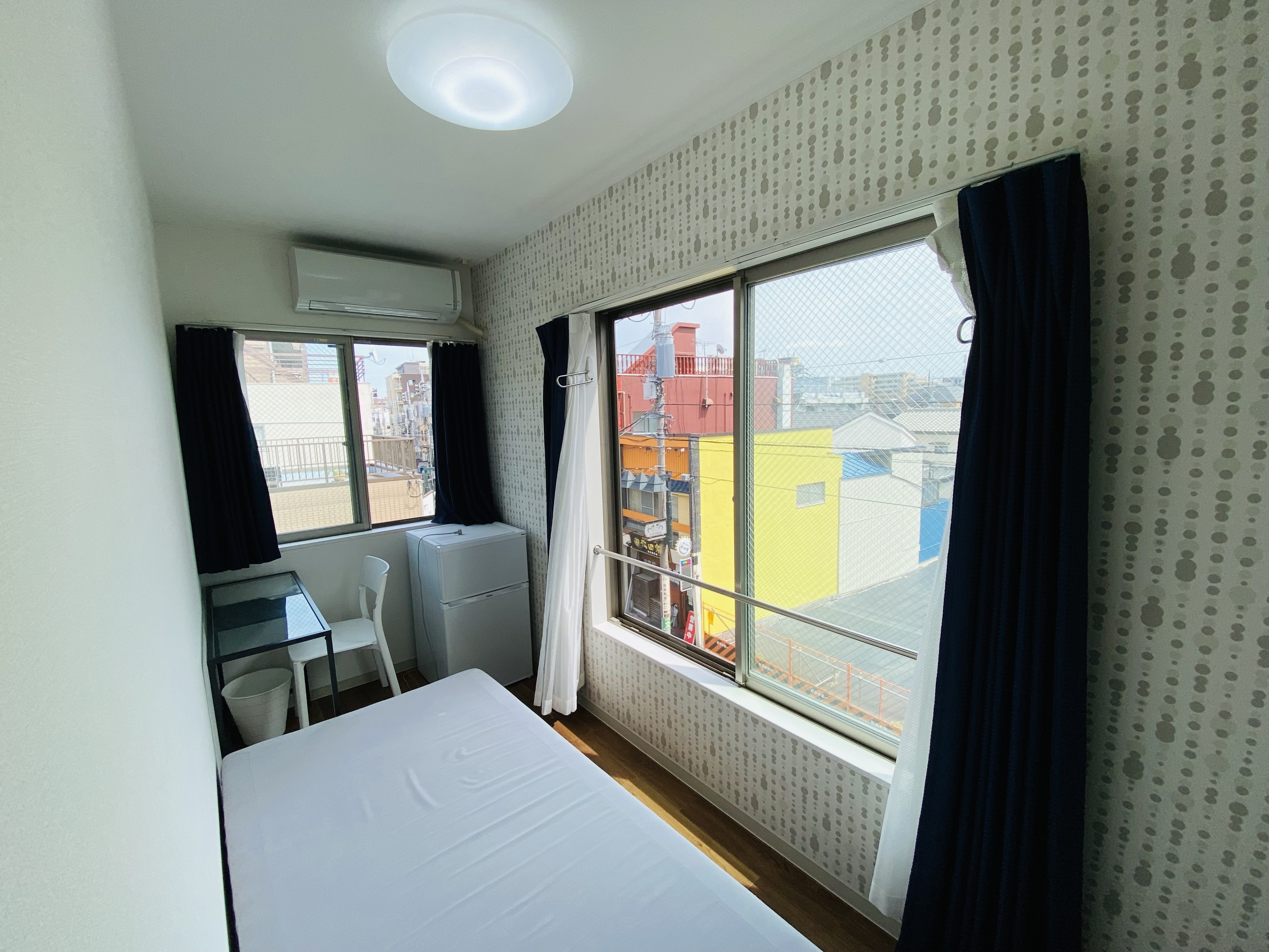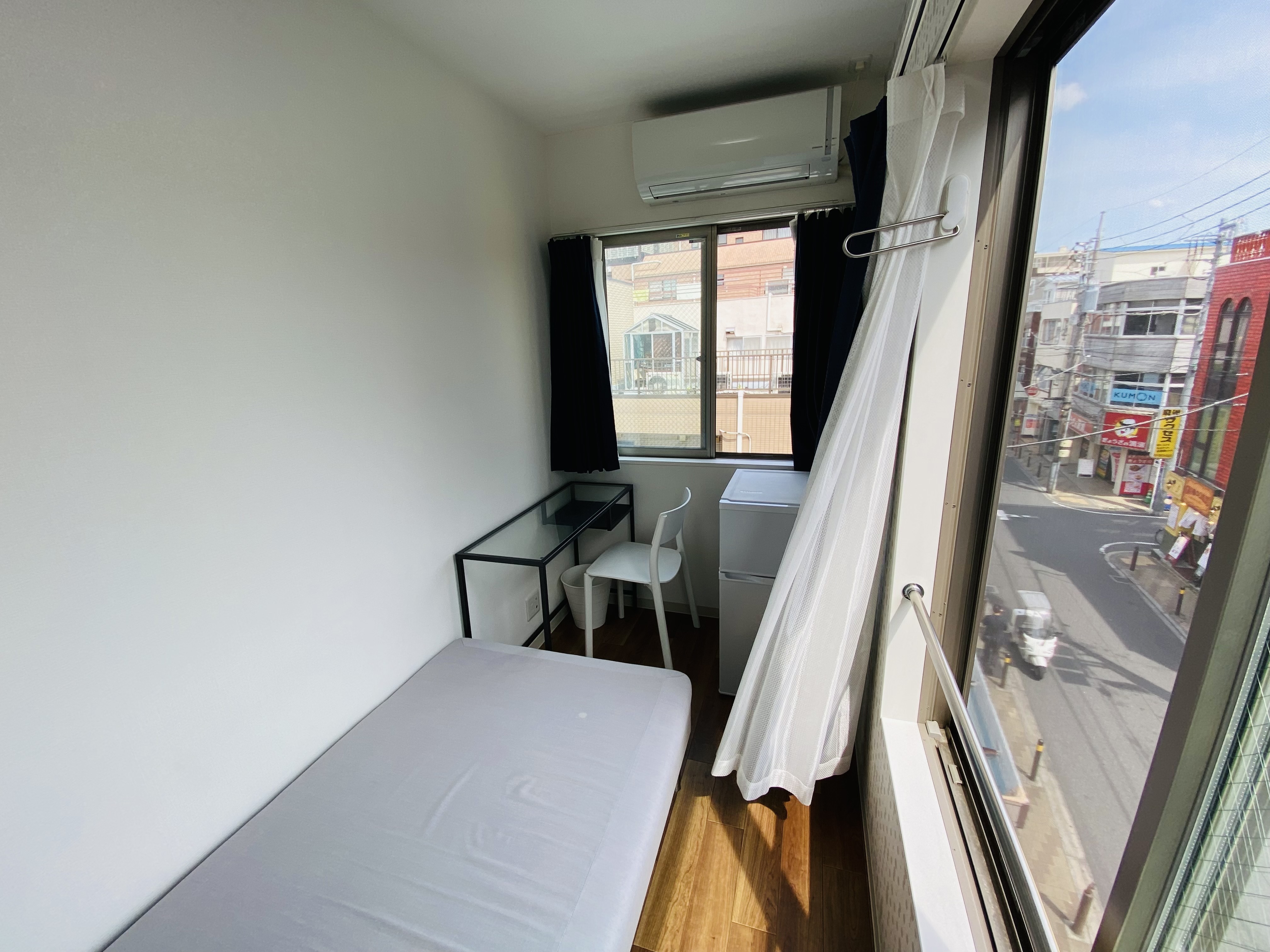 | 部屋設備 | エアコン・机・椅子・冷蔵庫・ベット・収納ラック・カーテン・室内物干し・2面採光 |