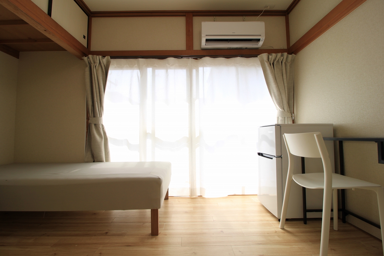 | 部屋設備 | ベッド・机・イス・カーテン・照明器具・冷蔵庫・エアコン・収納棚・物干し器具 |