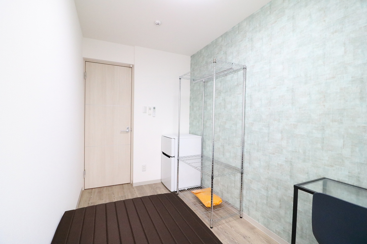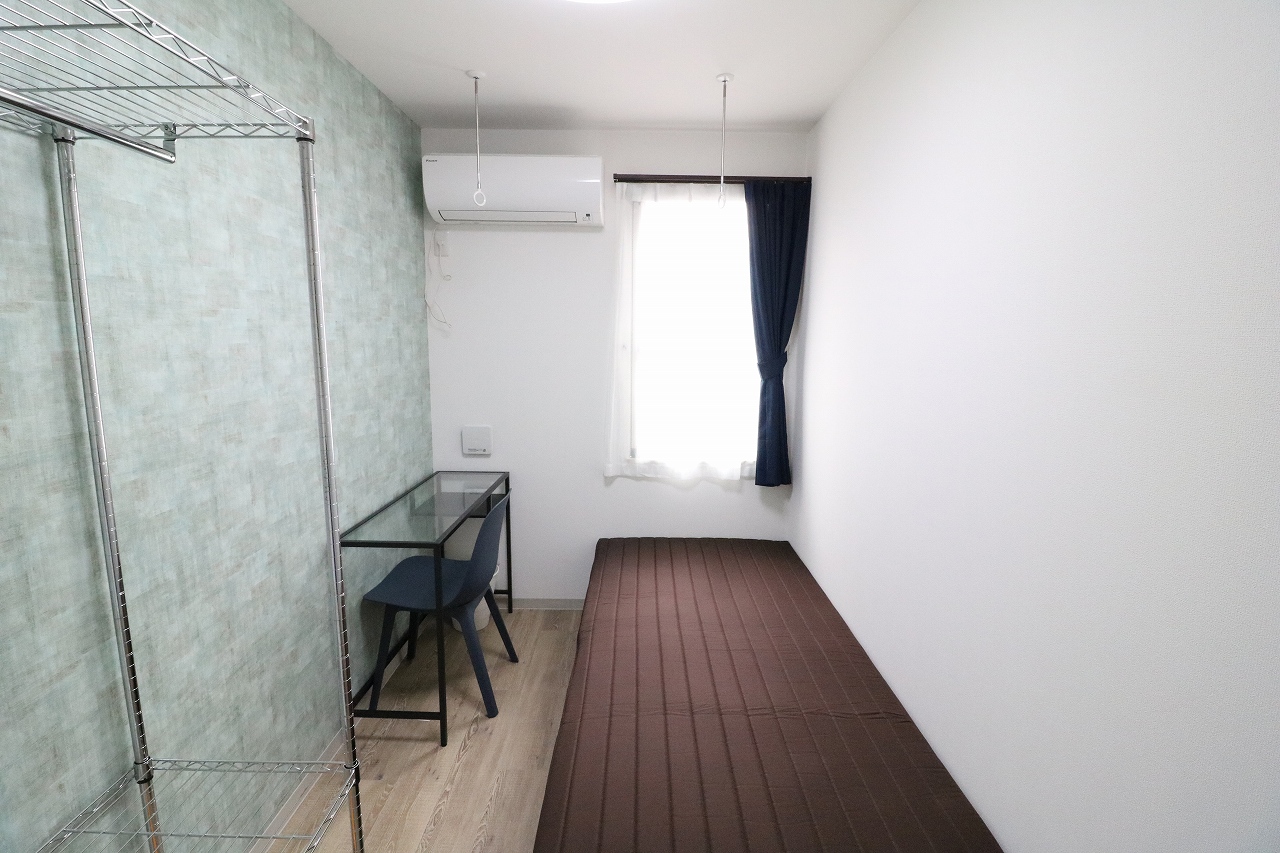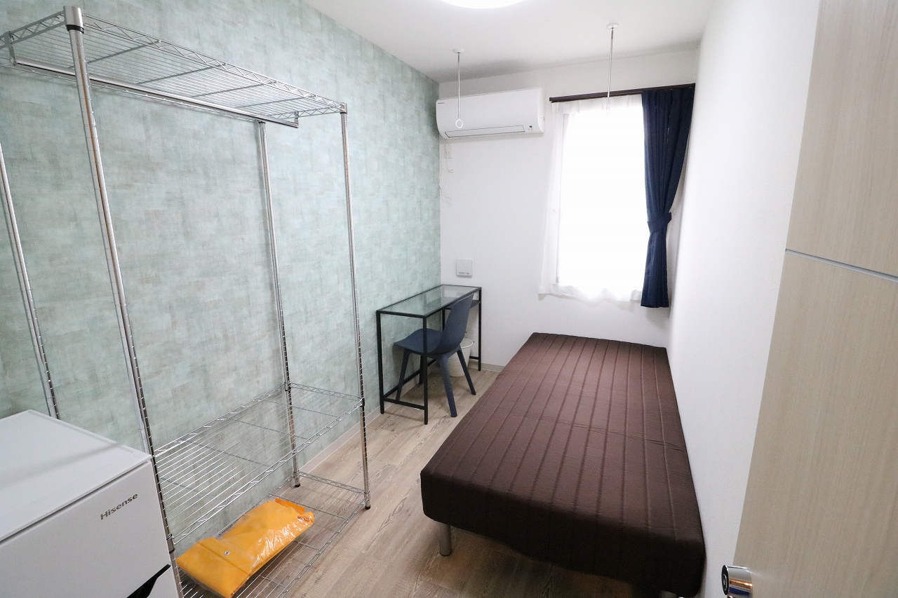 | 部屋設備 | エアコン・机・椅子・照明・冷蔵庫・ベット・収納ラック・カーテン・室内物干し・各居室インターネット |