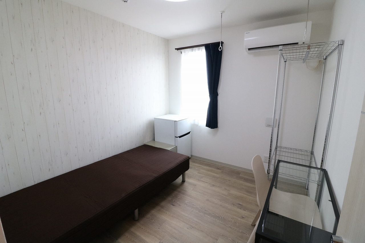 | 部屋設備 | エアコン・机・椅子・照明・冷蔵庫・ベット・収納ラック・カーテン・室内物干し・各居室インターネット |
