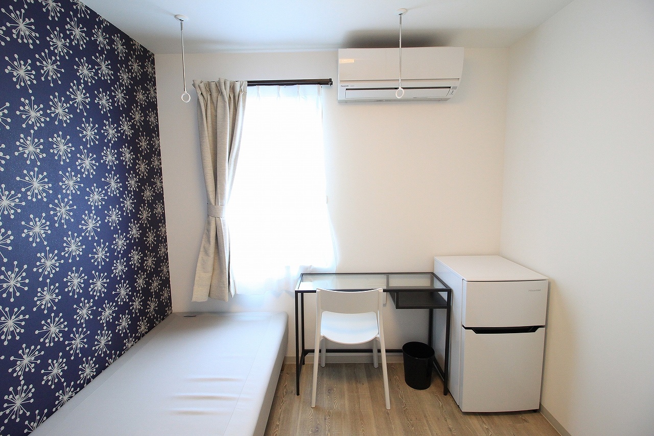 | 部屋設備 | ベッド・机・イス・カーテン・照明器具・冷蔵庫・エアコン・収納棚・物干し器具 |