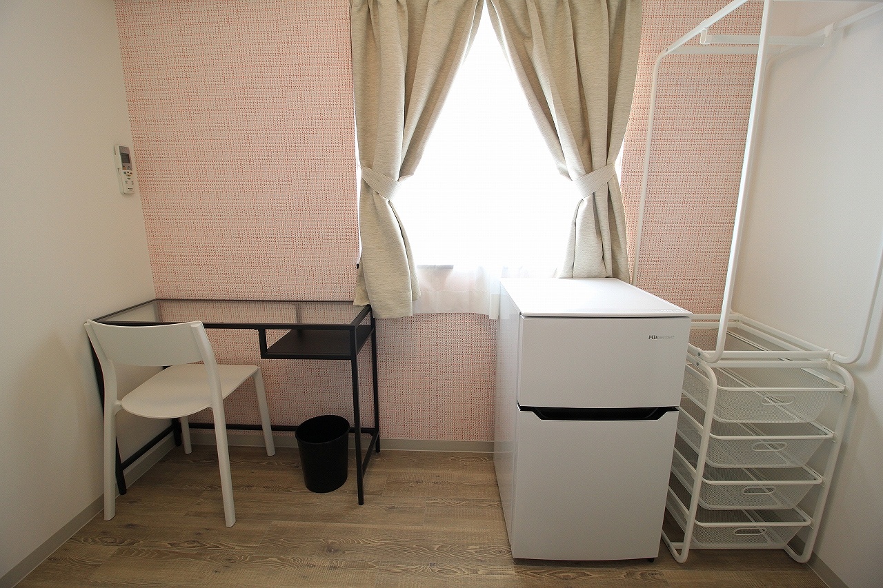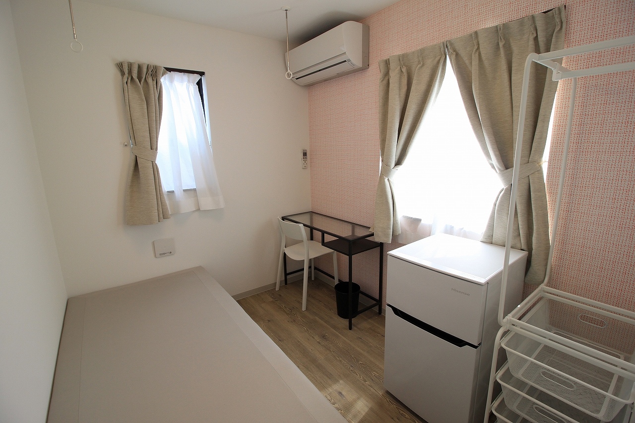 | 部屋設備 | ベッド・机・イス・カーテン・照明器具・冷蔵庫・エアコン・収納棚・物干し器具 |