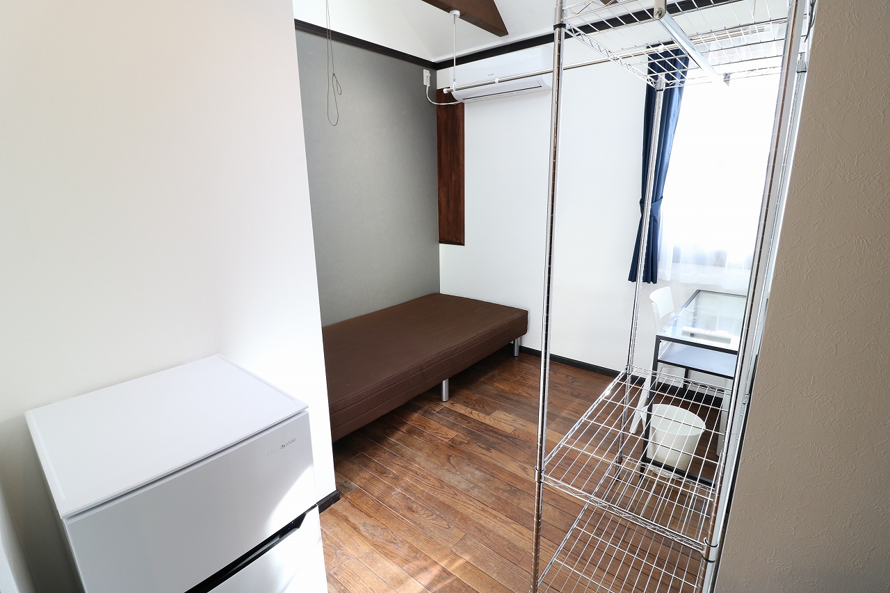 | 部屋設備 | ベッド・机・イス・照明器具・エアコン・冷蔵庫・カーテン・収納ラック・室内物干し |