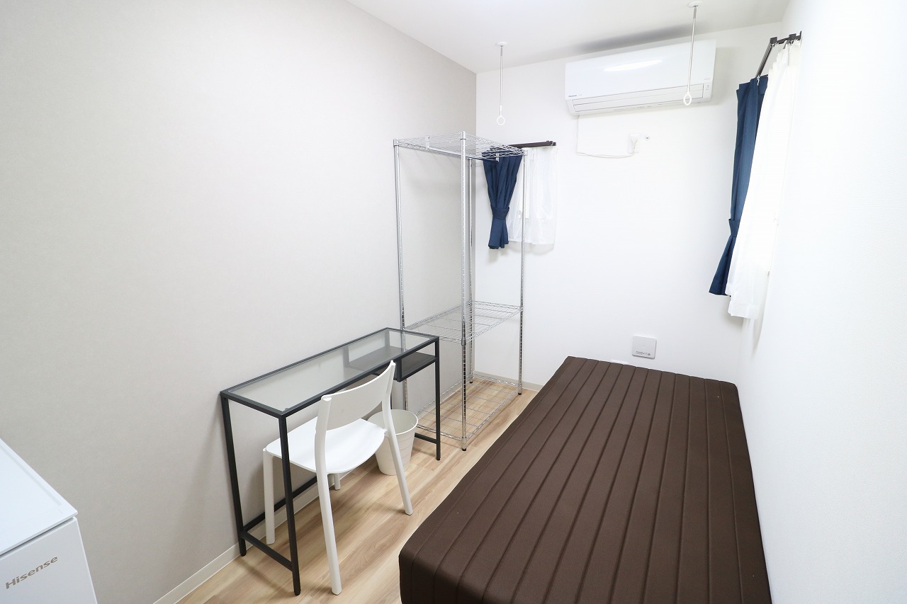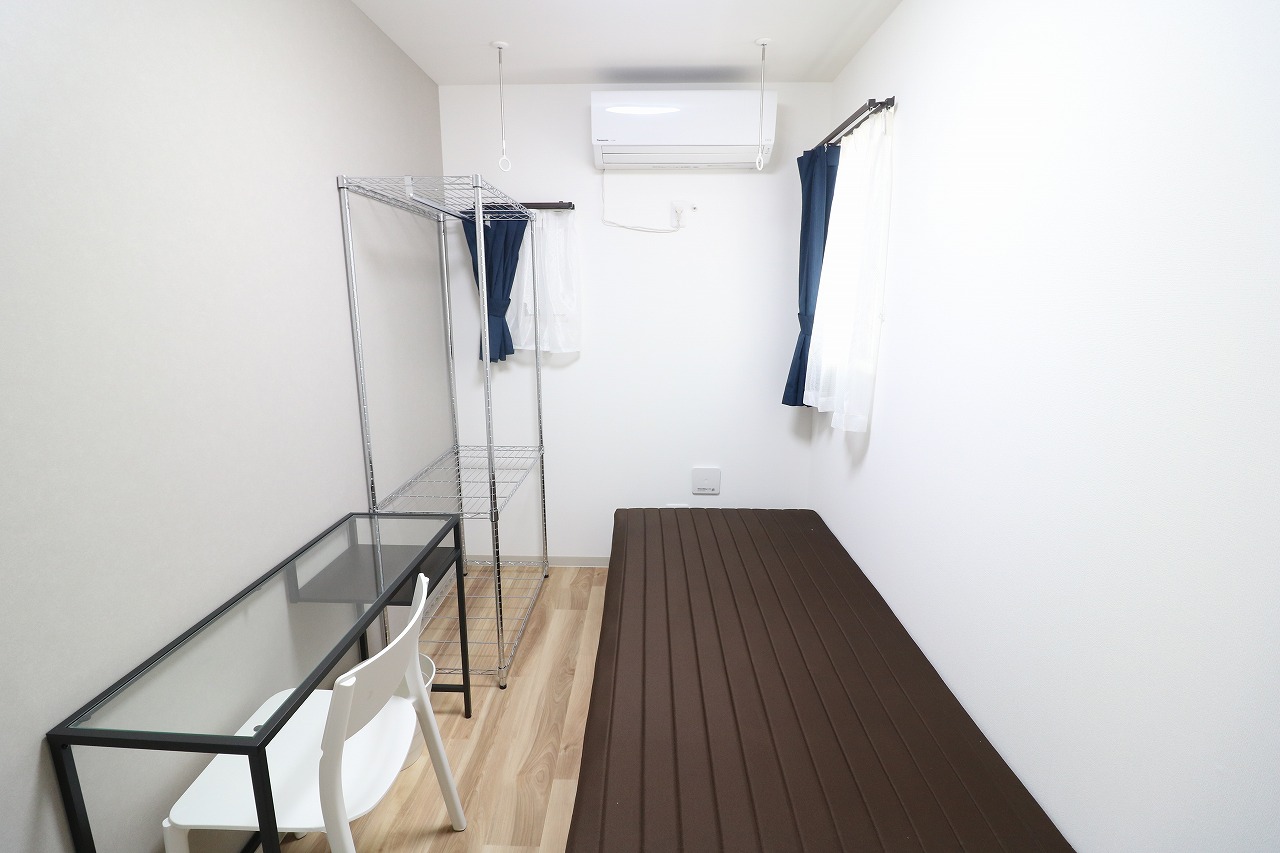 | 部屋設備 | ベッド・机・イス・カーテン・照明器具・冷蔵庫・エアコン・収納棚・物干し器具 |