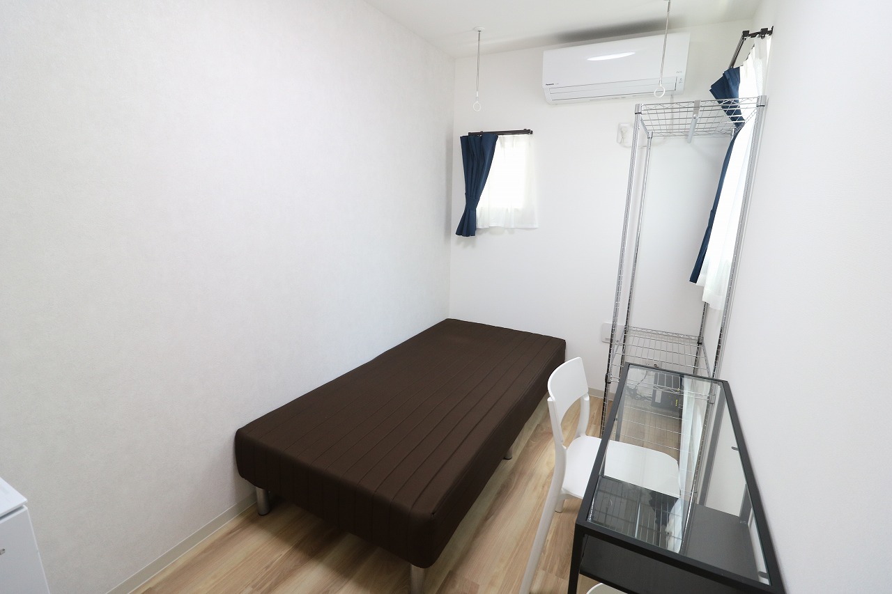 | 部屋設備 | ベッド・机・イス・カーテン・照明器具・冷蔵庫・エアコン・収納棚・物干し器具 |