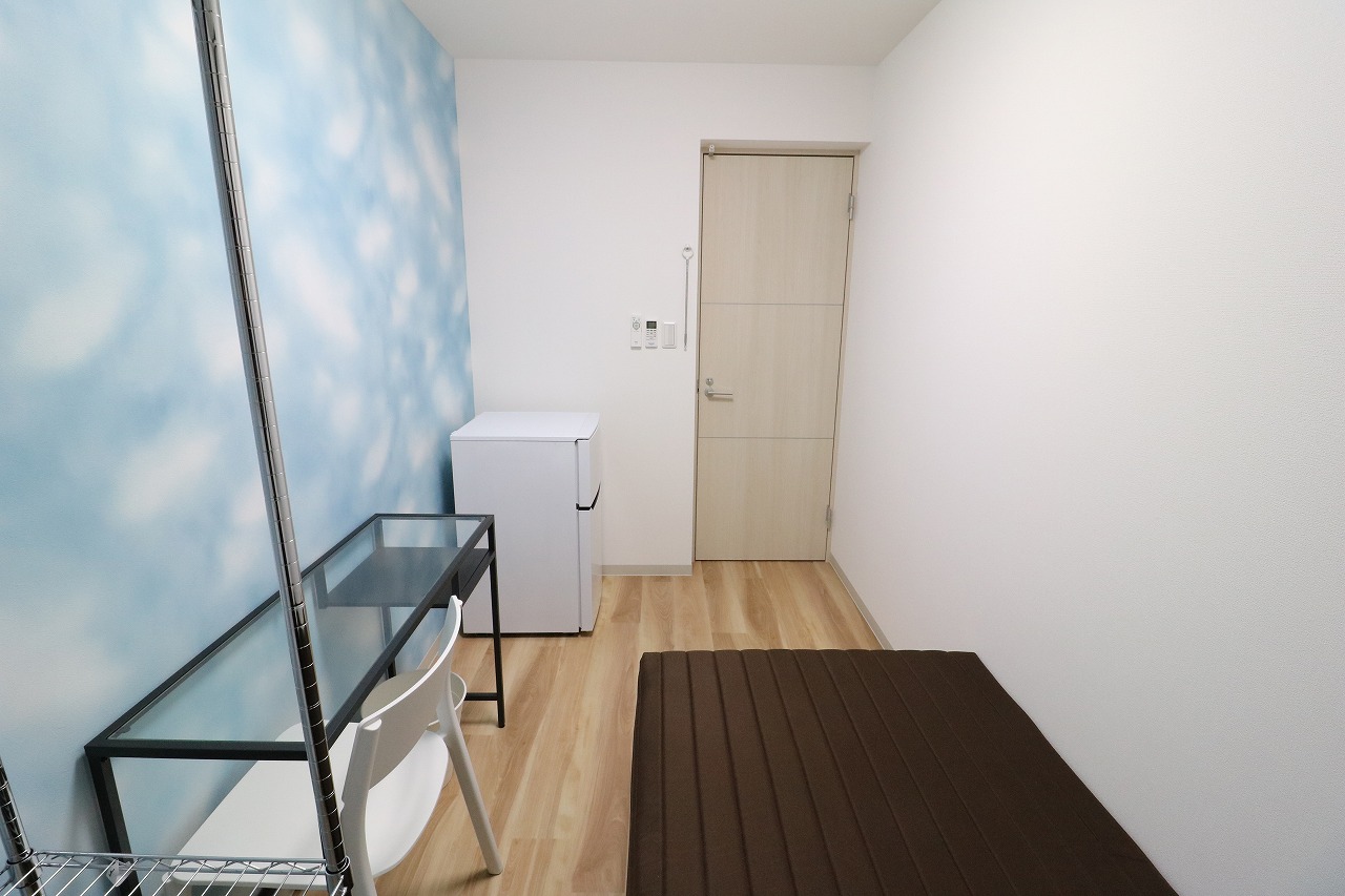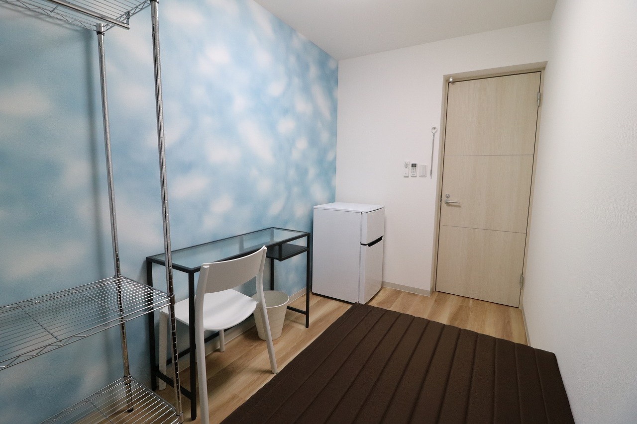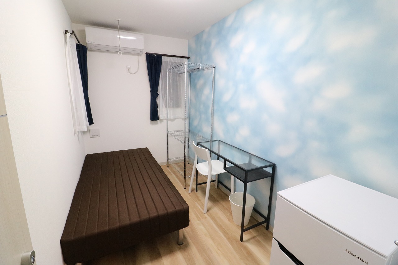 | 部屋設備 | ベッド、机、椅子、エアコン、物干し、収納ラック |
