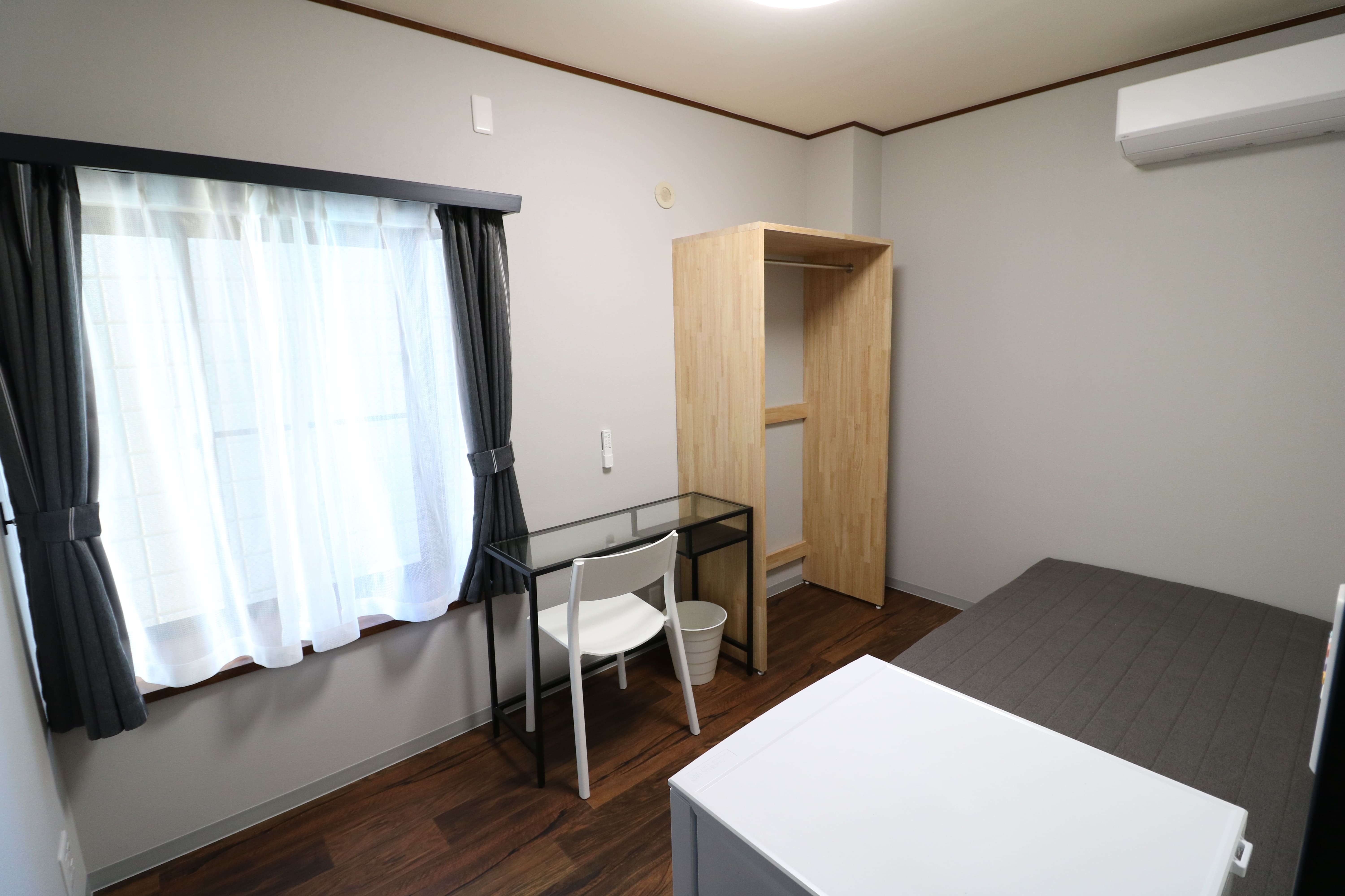 | 部屋設備 | ベッド、机、イス、照明器具、エアコン、冷蔵庫、カーテン、クローゼット |
