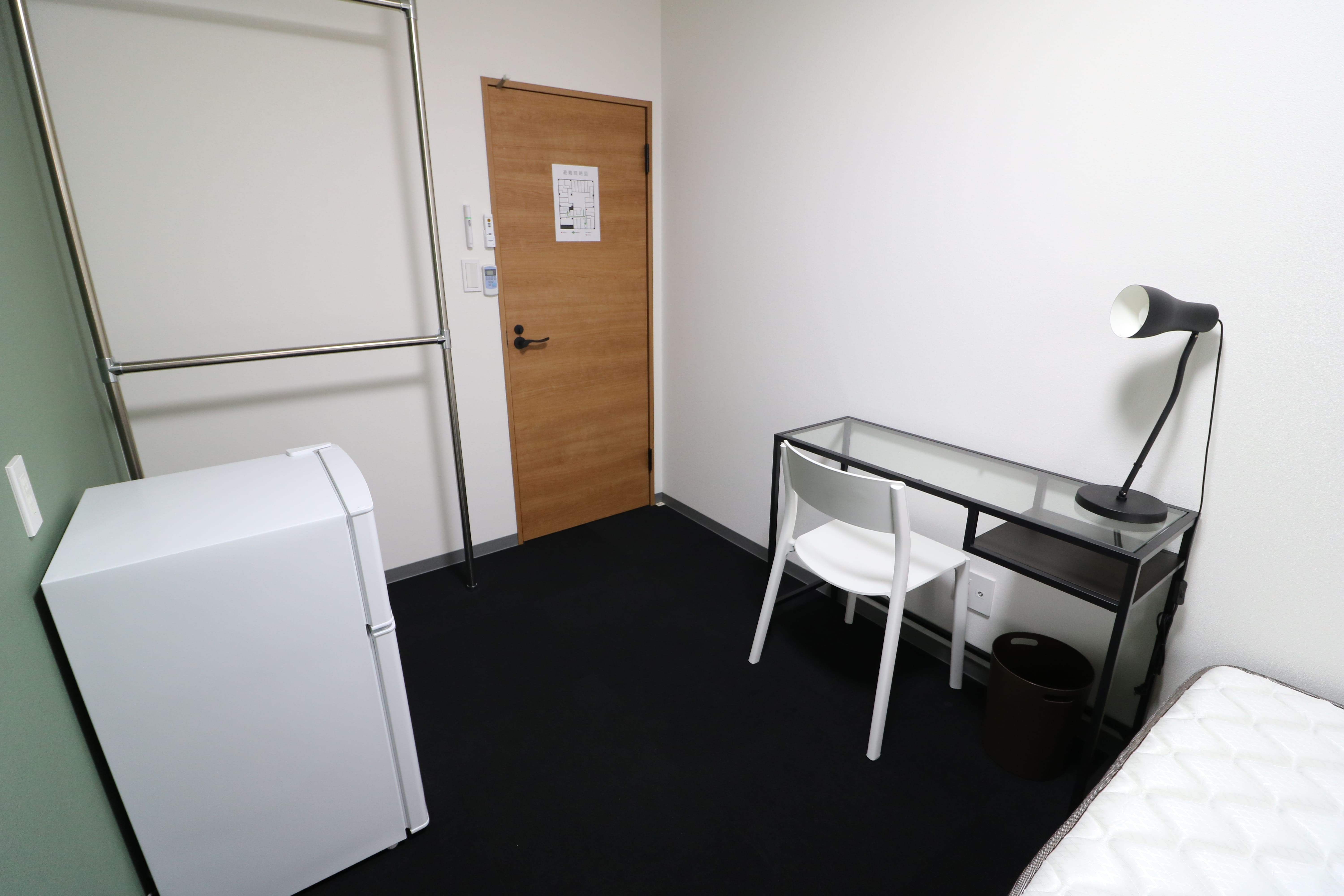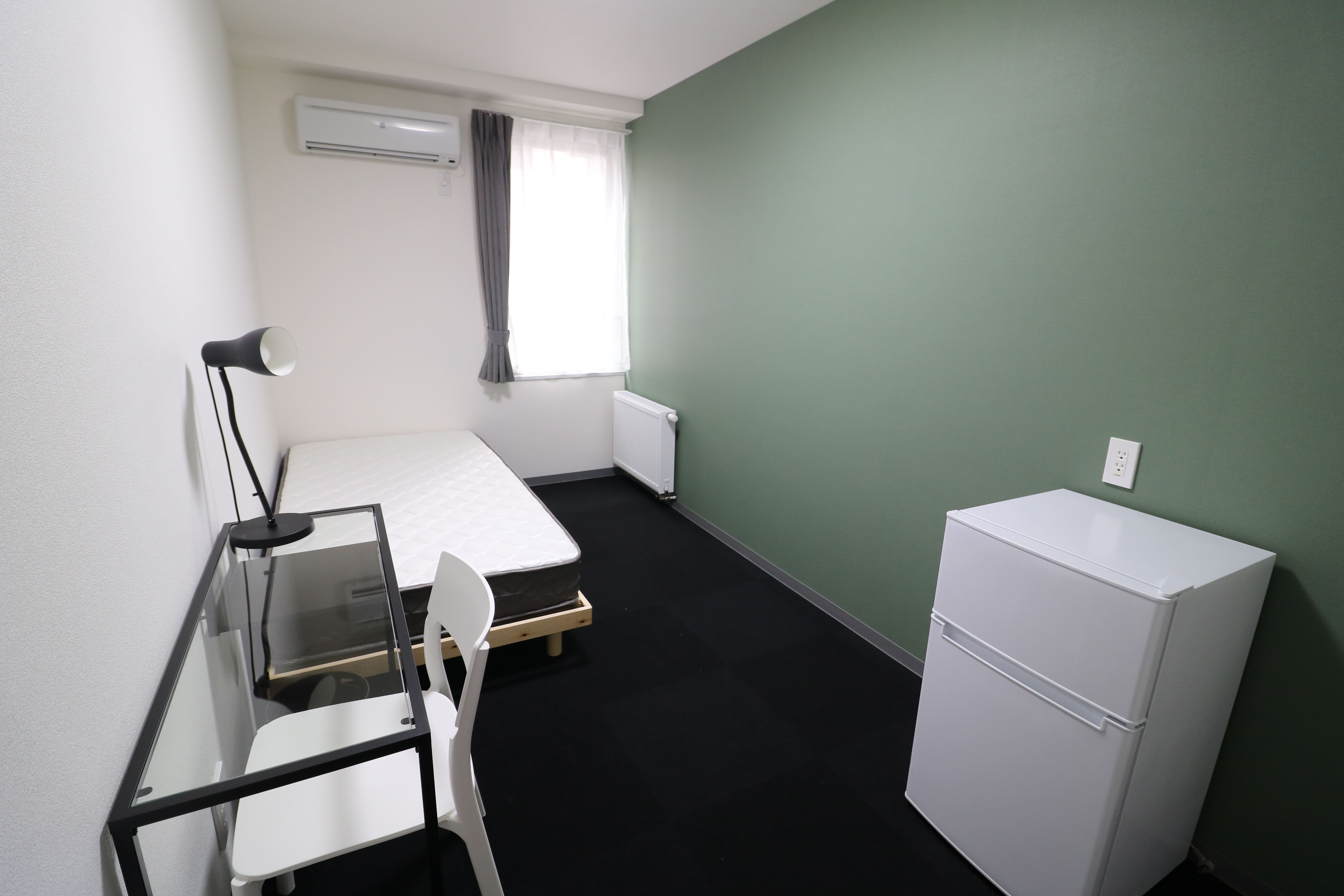 | 部屋設備 | シングルベッド、マットレス、机、椅子、冷蔵庫、シーリングライト、デスクライト、ハンガーポール、カーテン、冷房専用エアコン、パネルヒーター、テレビジャック |