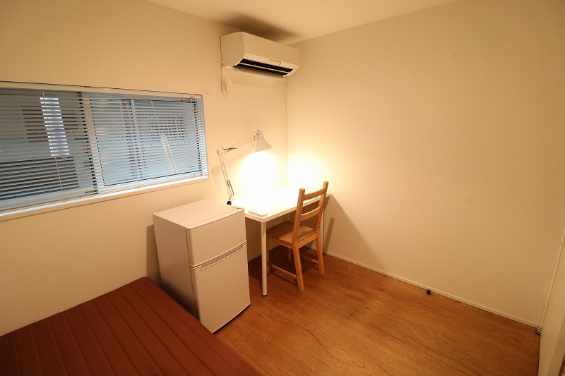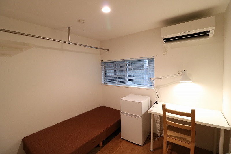 | 部屋設備 | ベッド、机、イス、照明器具、エアコン、冷蔵庫、ブラインド、天井付ハンガーパイプ、デスクライト |