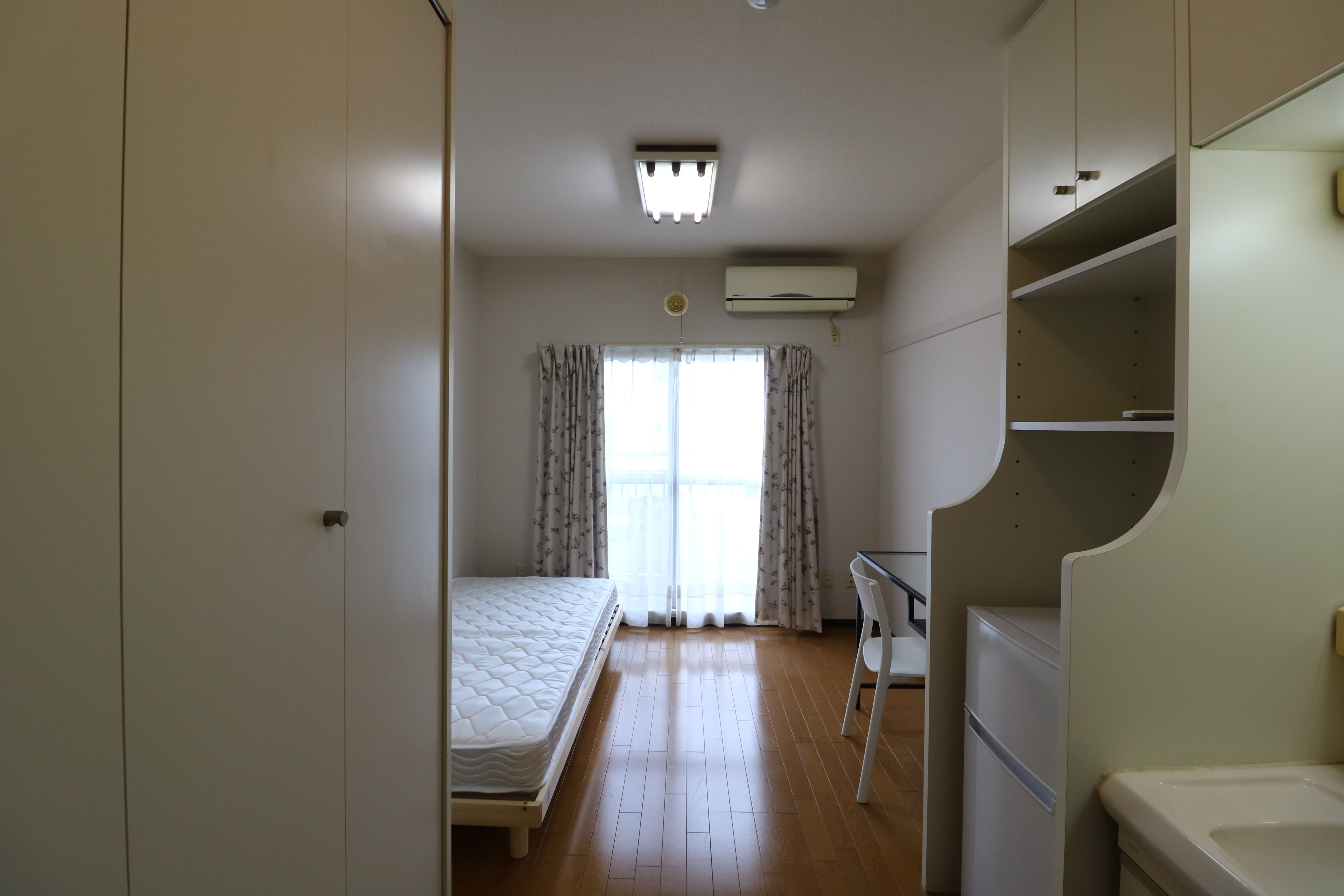 | 部屋設備 | 机、イス、冷蔵庫、ベッド、照明器具、エアコン、カーテン、収納、洗面台、バルコニー |