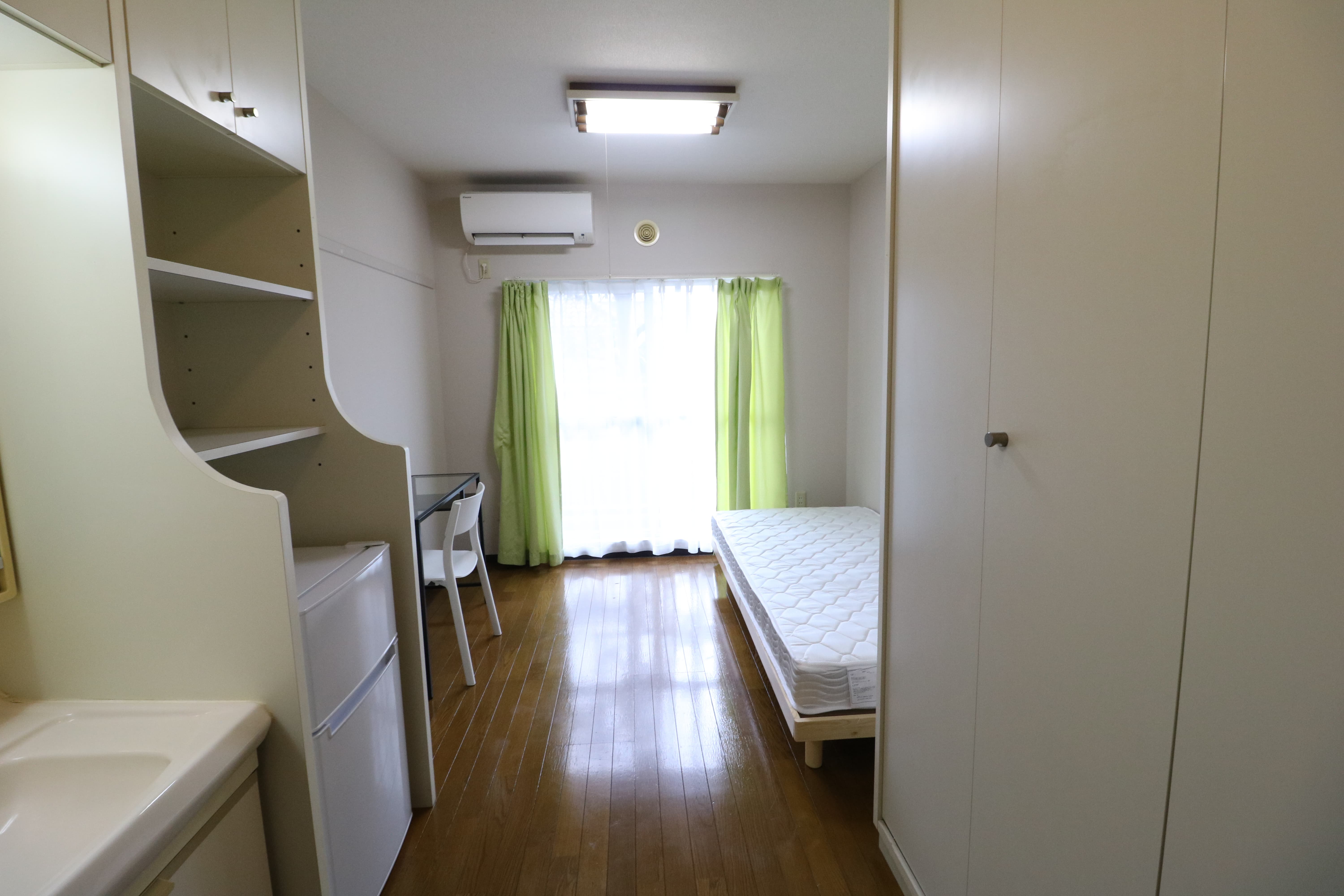 | 部屋設備 | 机、イス、冷蔵庫、ベッド、照明器具、エアコン、カーテン、収納、洗面台、バルコニー |