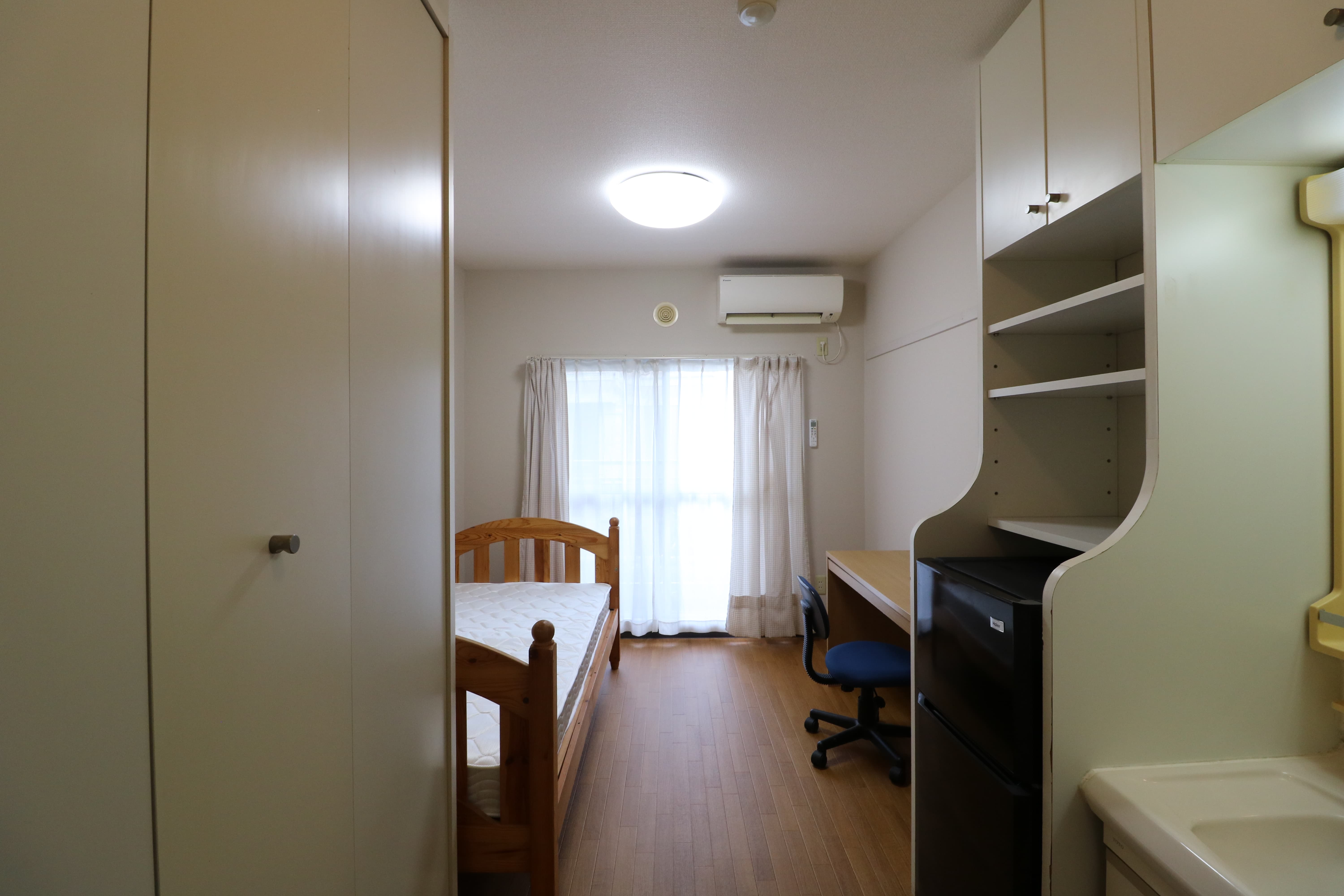 | 部屋設備 | 机、イス、冷蔵庫、ベッド、照明器具、エアコン、カーテン、収納、洗面台、バルコニー |