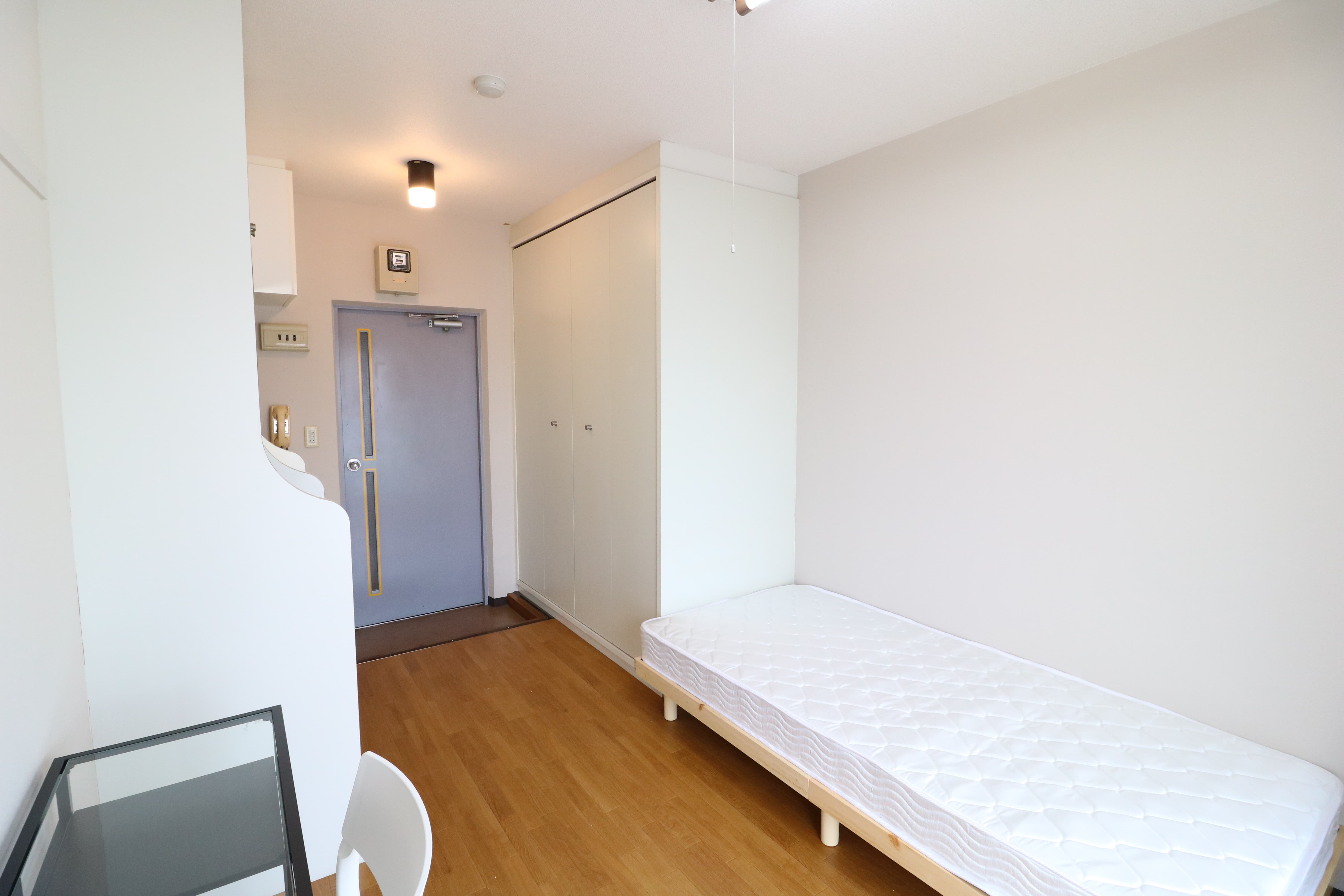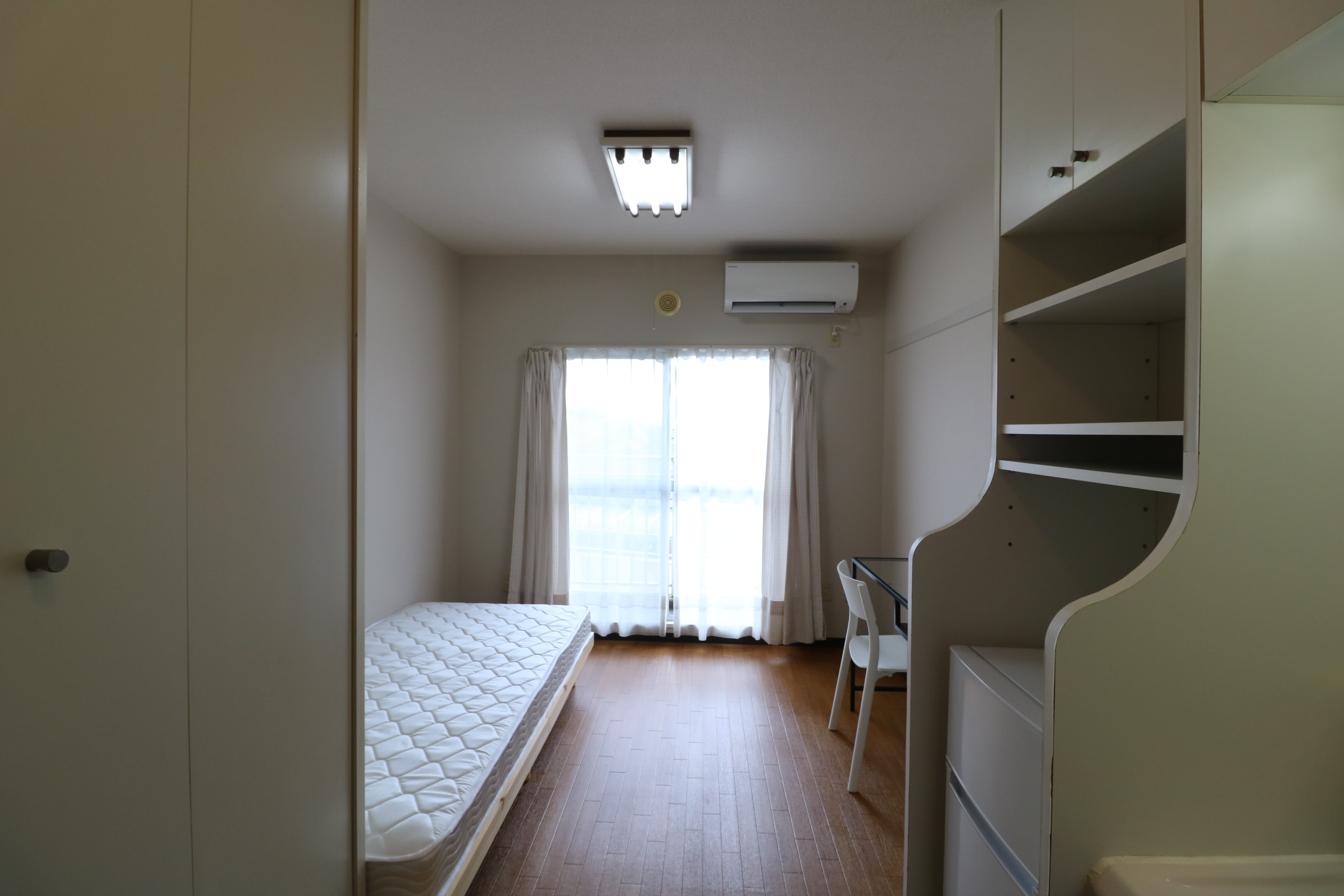 | 部屋設備 | 机、イス、冷蔵庫、ベッド、照明器具、エアコン、カーテン、収納、洗面台、バルコニー |