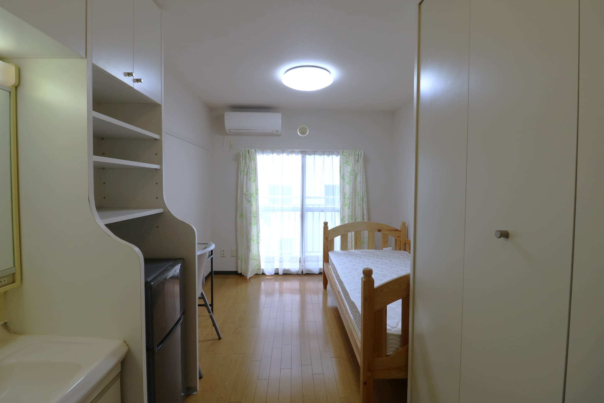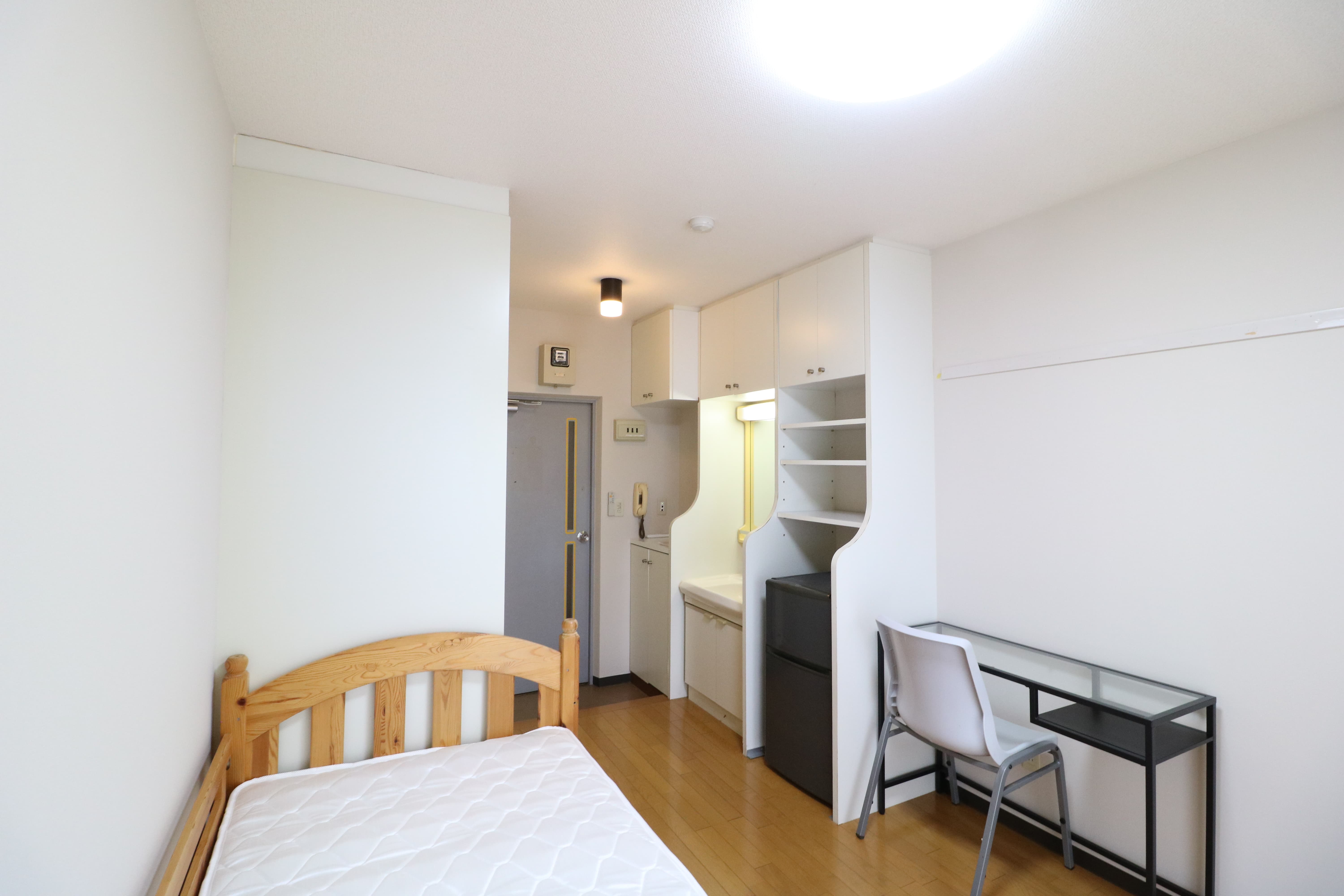 | 部屋設備 | 机、イス、冷蔵庫、ベッド、照明器具、エアコン、カーテン、収納、洗面台、バルコニー |