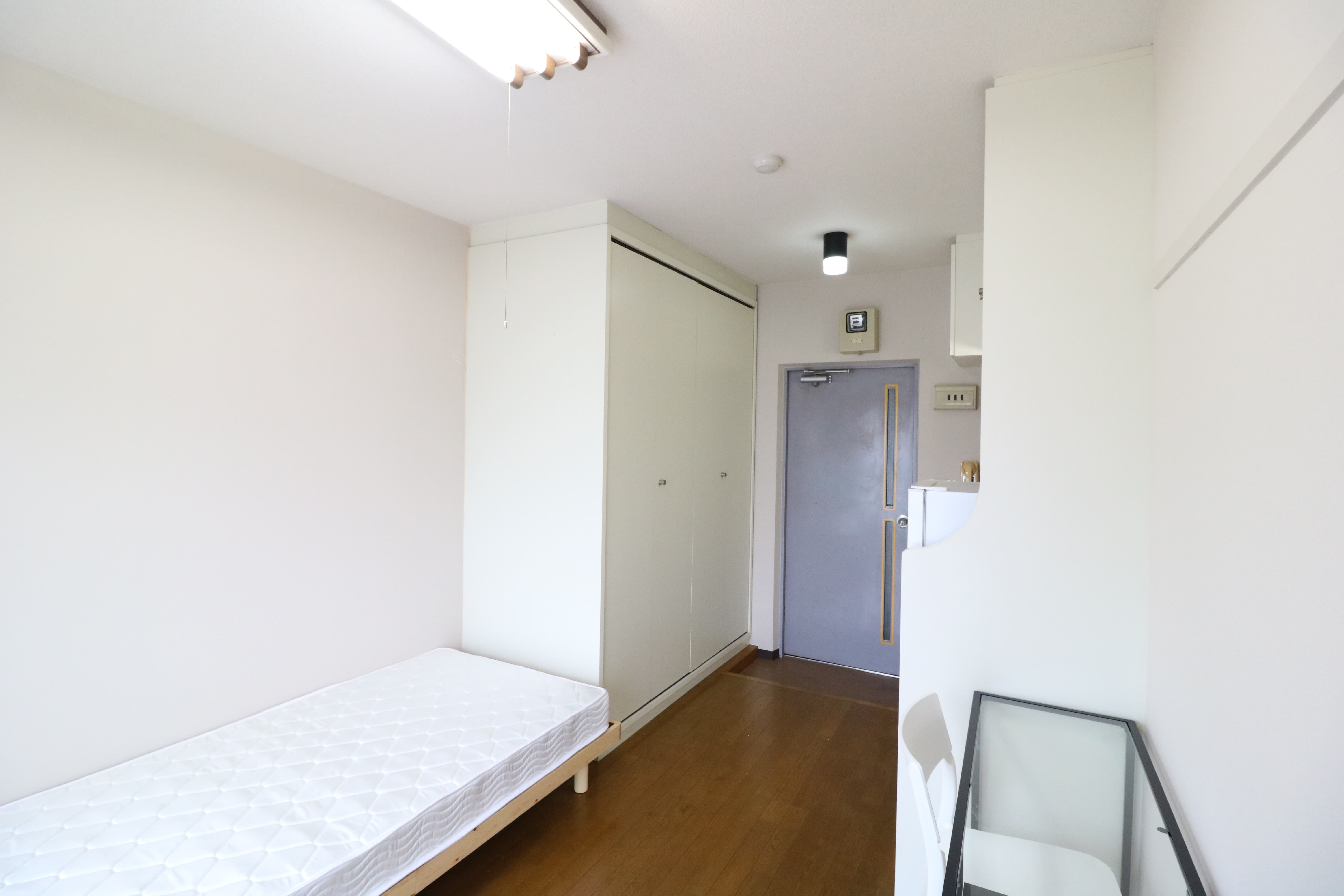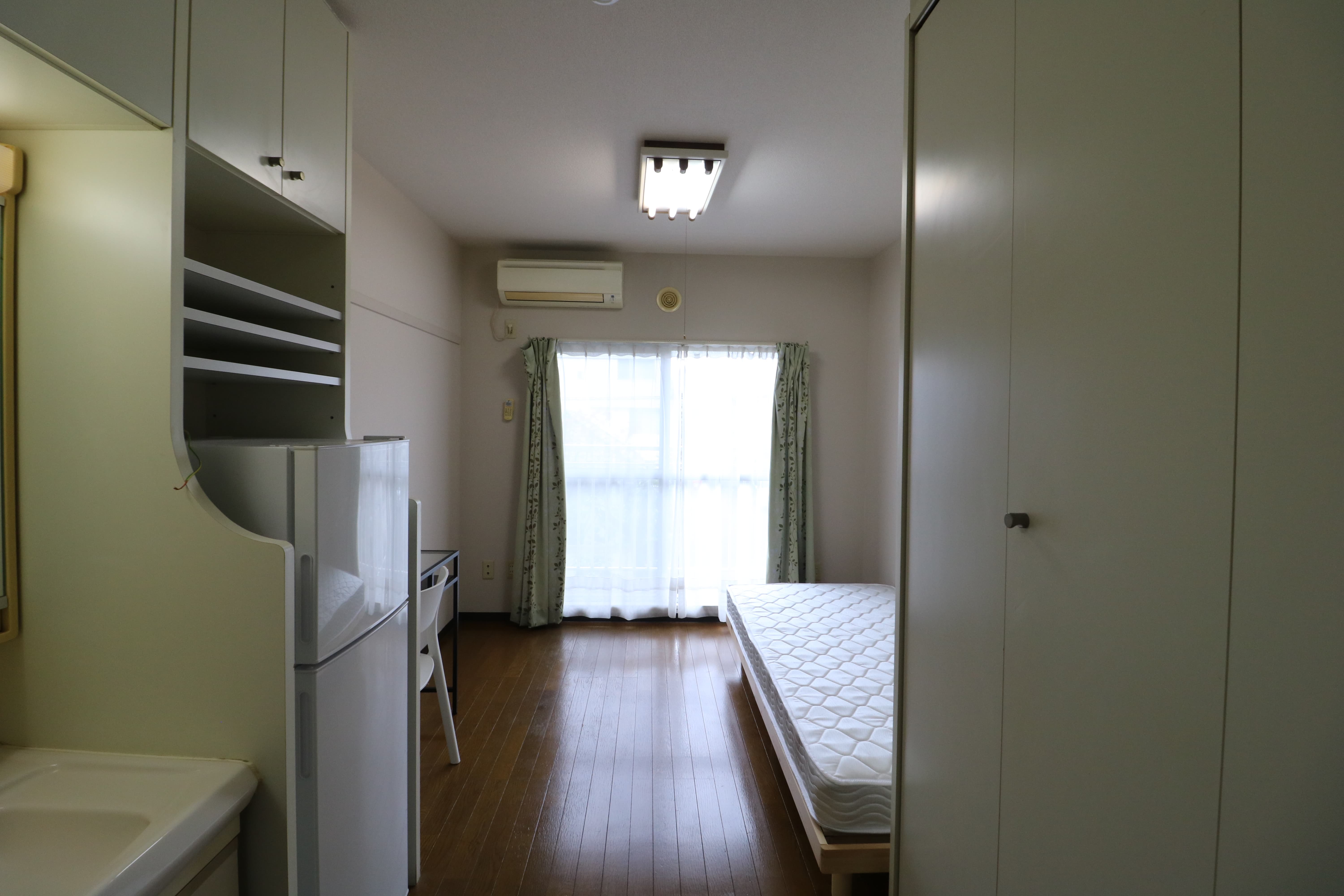| 部屋設備 | 机、イス、冷蔵庫、ベッド、照明器具、エアコン、カーテン、収納、洗面台、バルコニー |