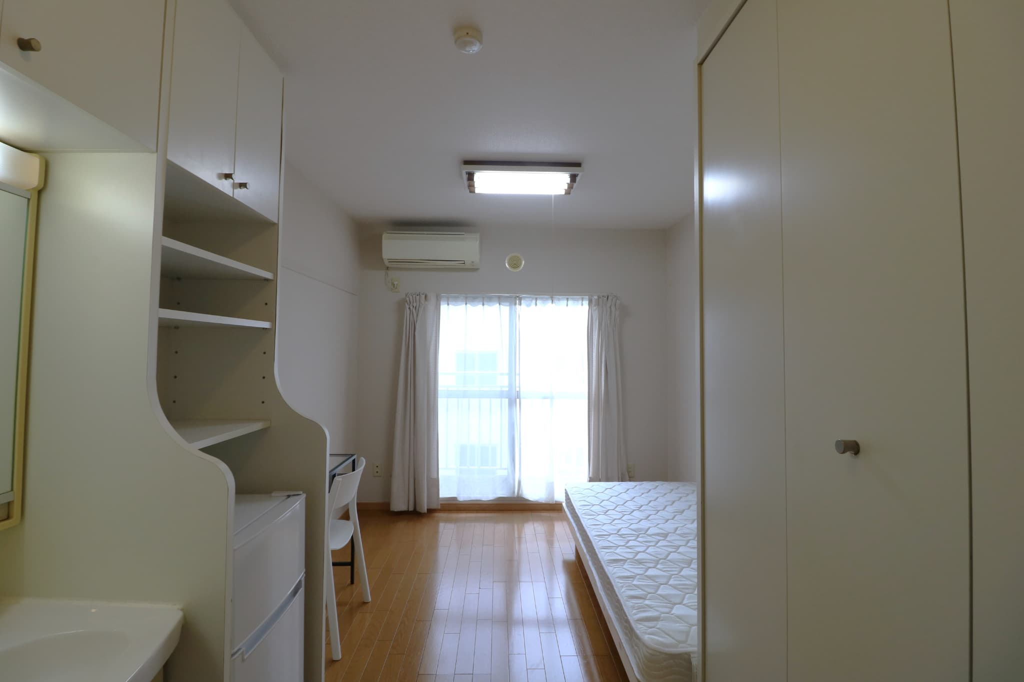 | 部屋設備 | 机、イス、冷蔵庫、ベッド、照明器具、エアコン、カーテン、収納、洗面台、バルコニー |