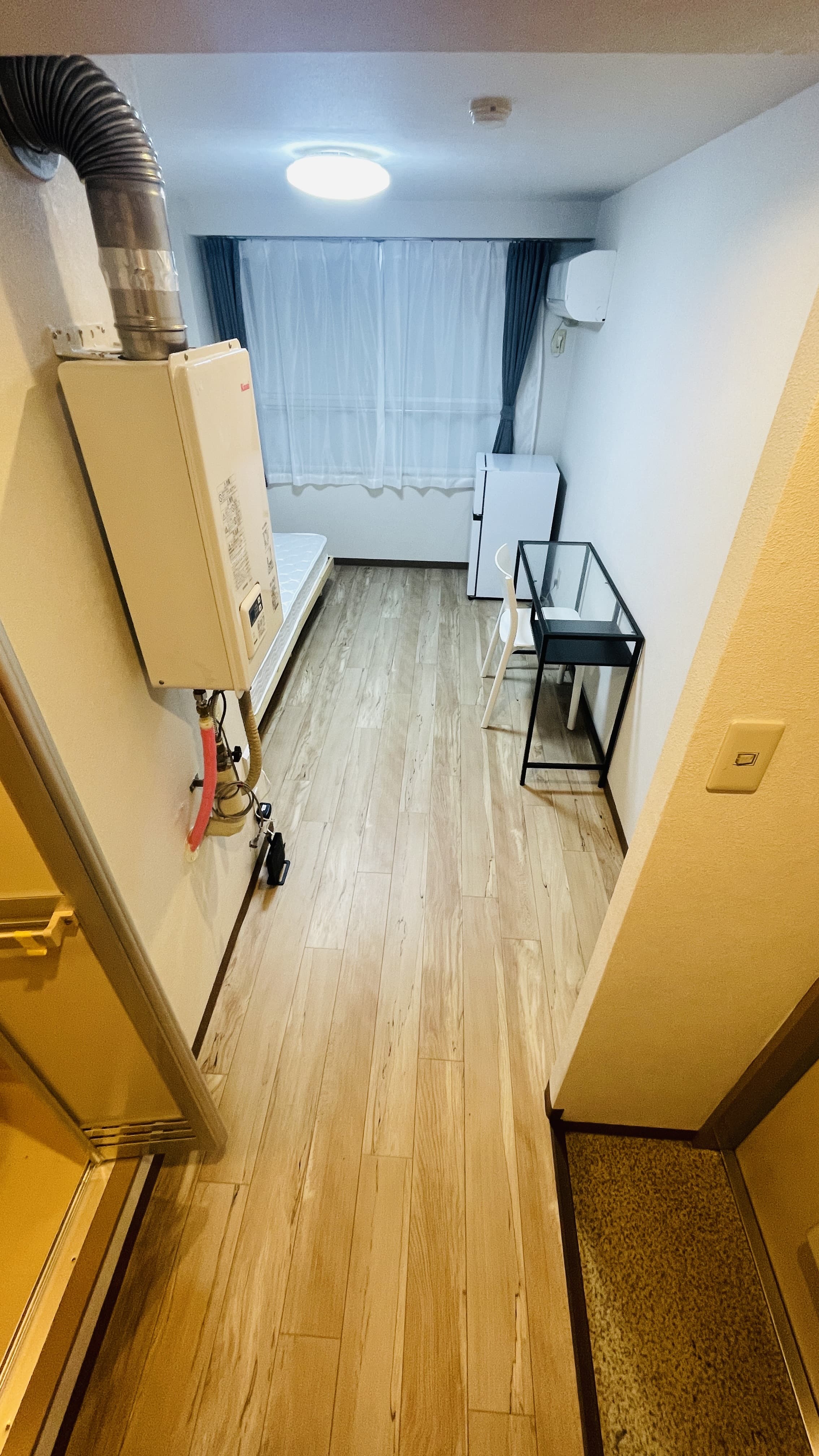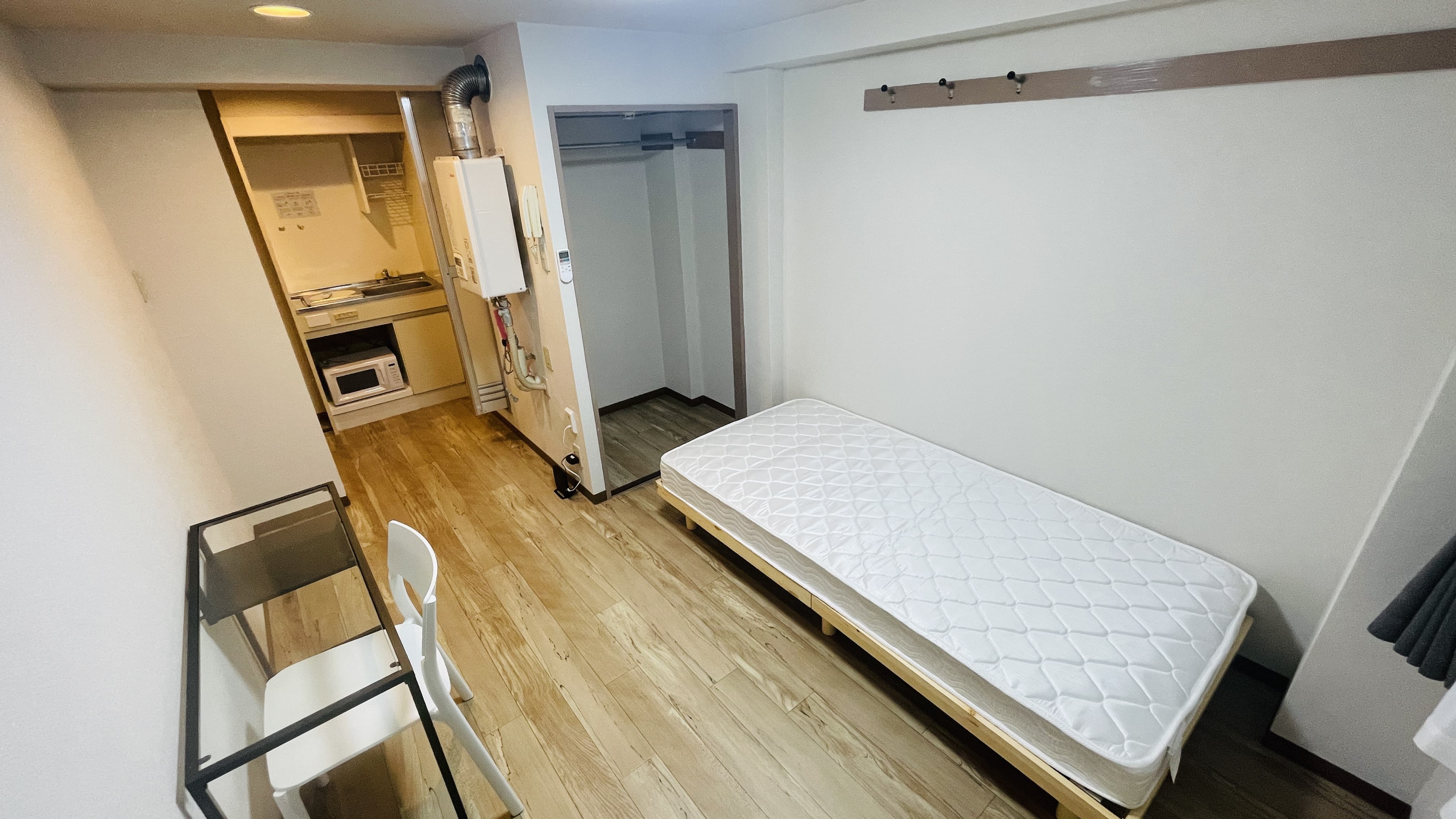 | 部屋設備 | 机、イス、照明器具、エアコン、冷蔵庫、カーテン、クローゼット,シングルベットフレーム , マットレス,キッチン,電子レンジ,3点ユニットバス |