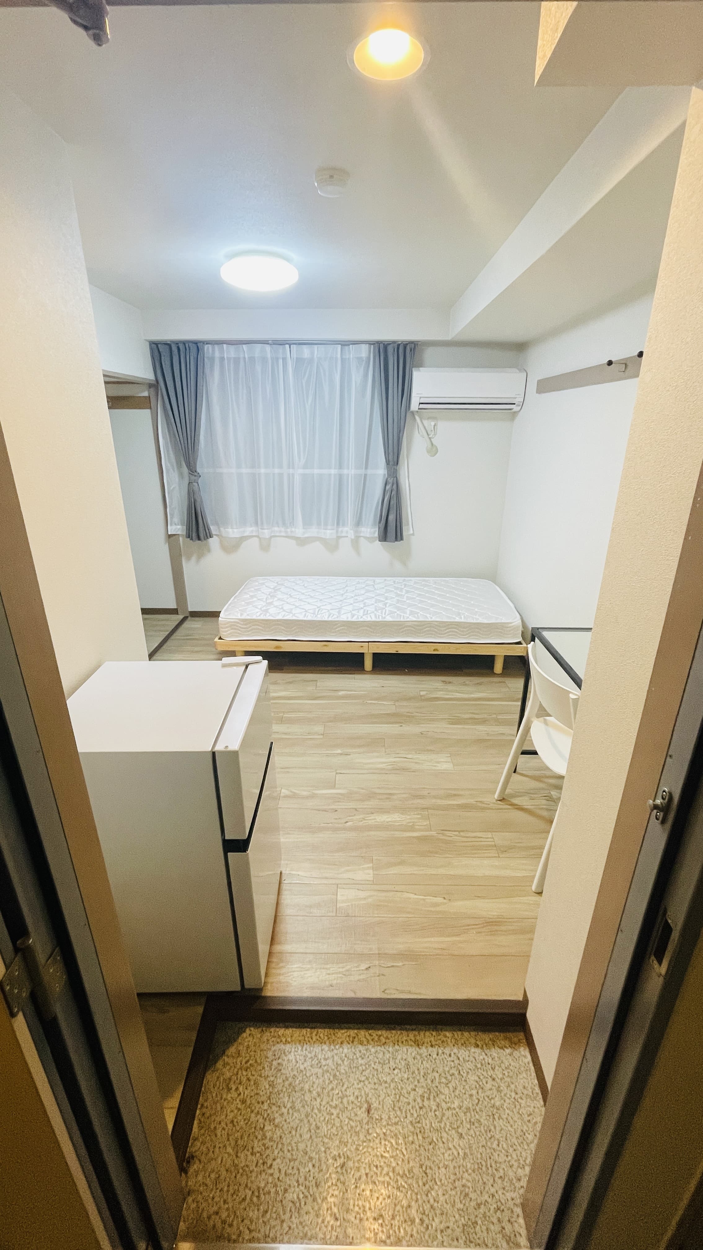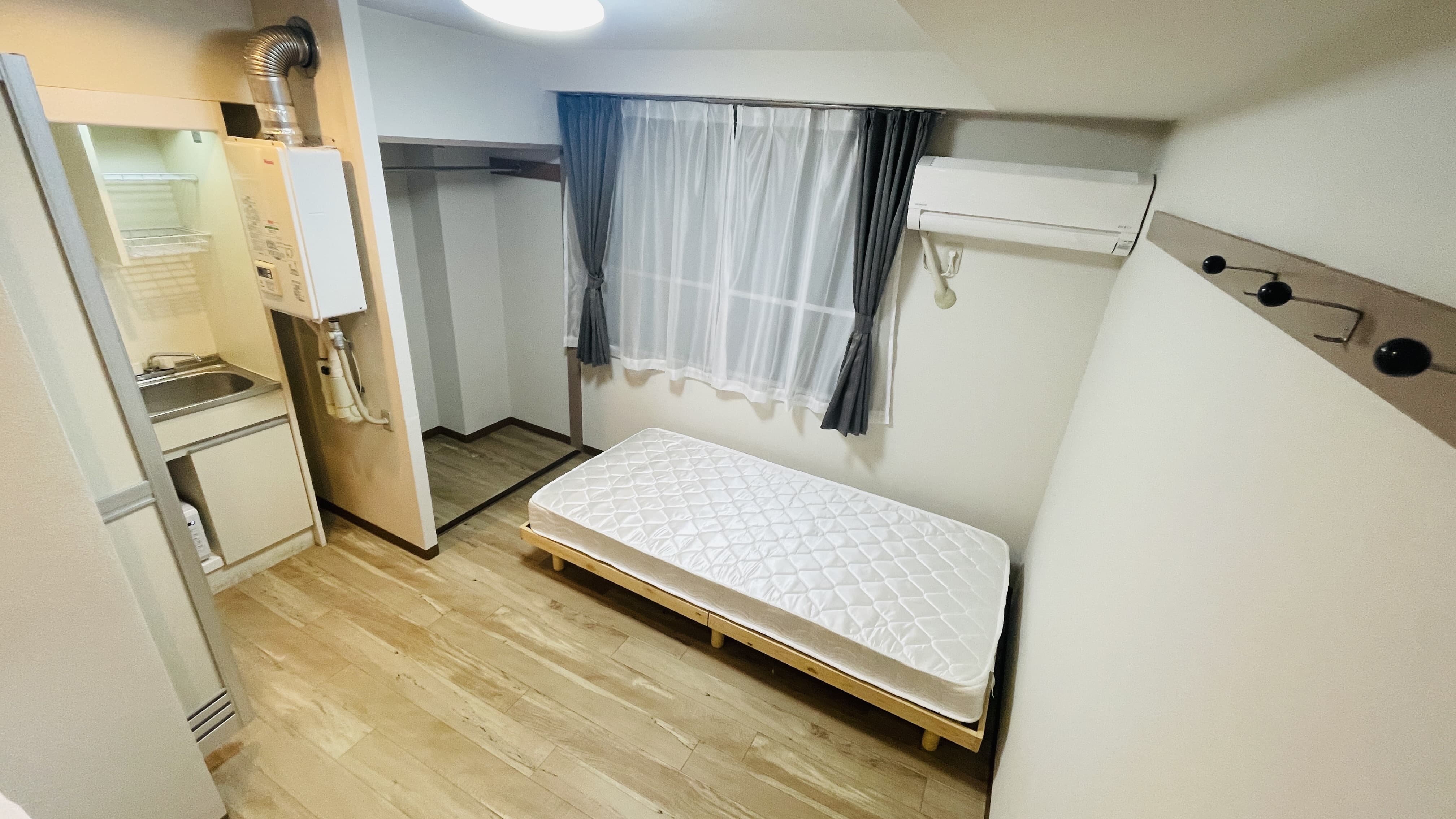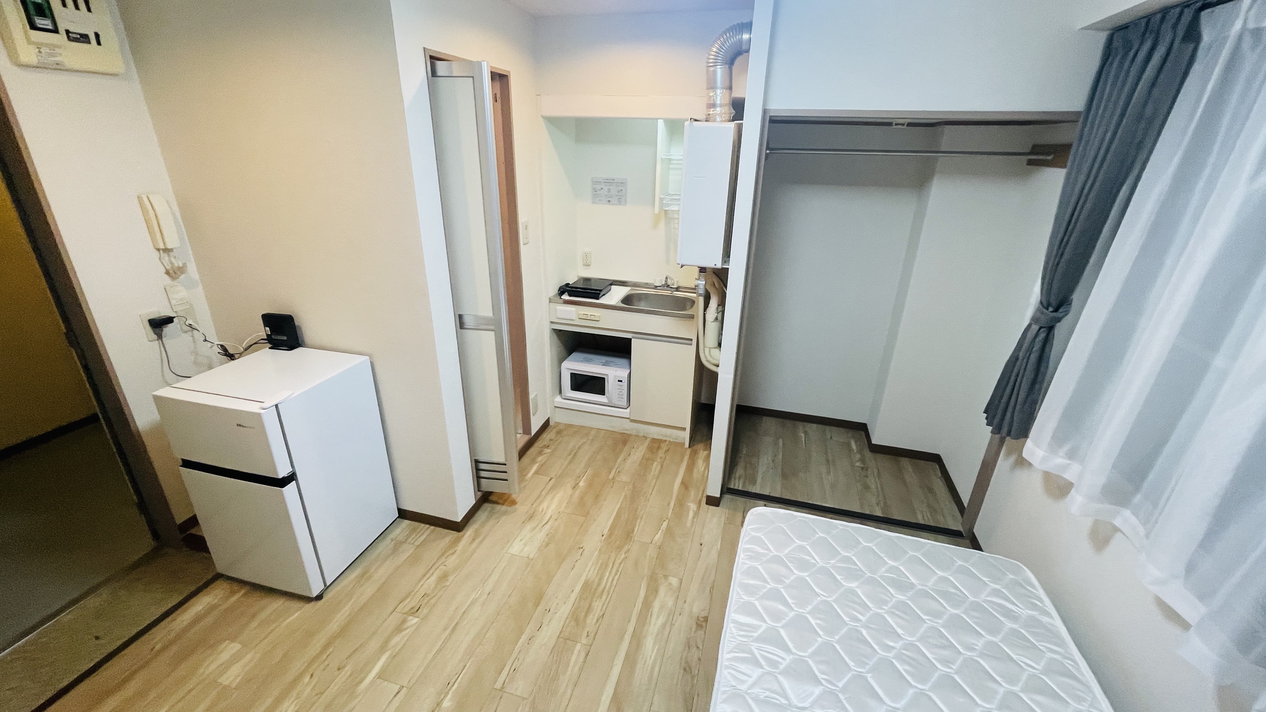 | 部屋設備 | 机、イス、照明器具、エアコン、冷蔵庫、カーテン、クローゼット,シングルベットフレーム , マットレス,キッチン,電子レンジ,3点ユニットバス |