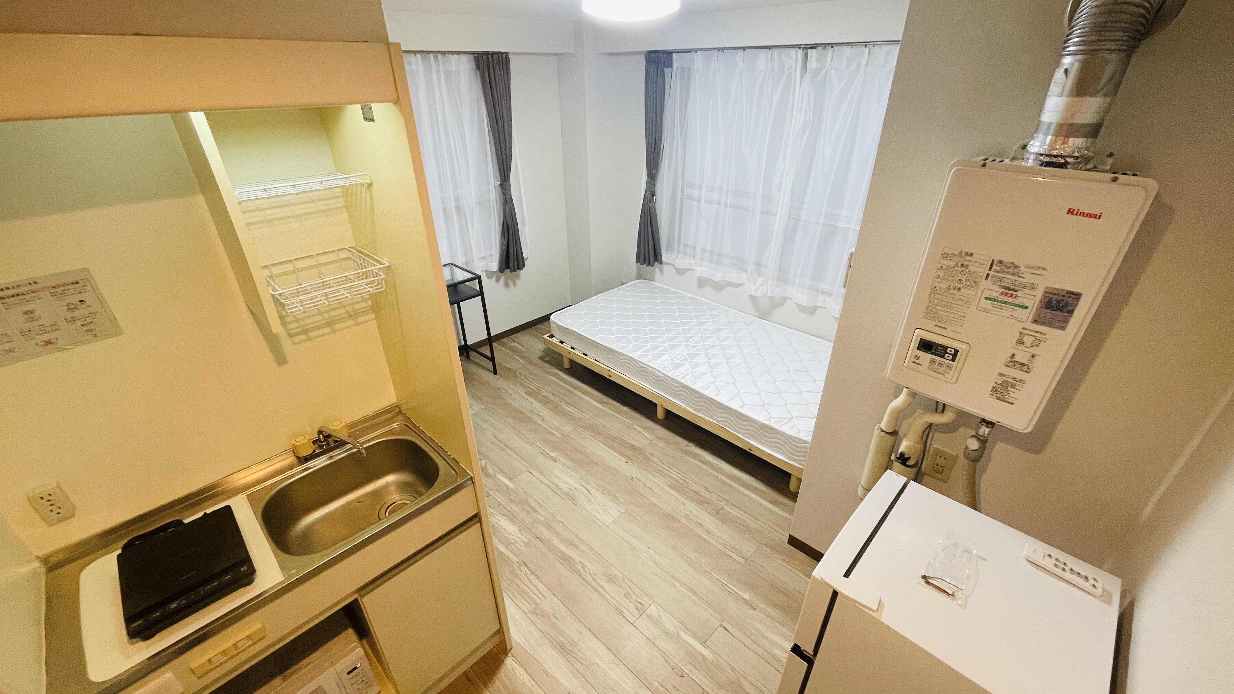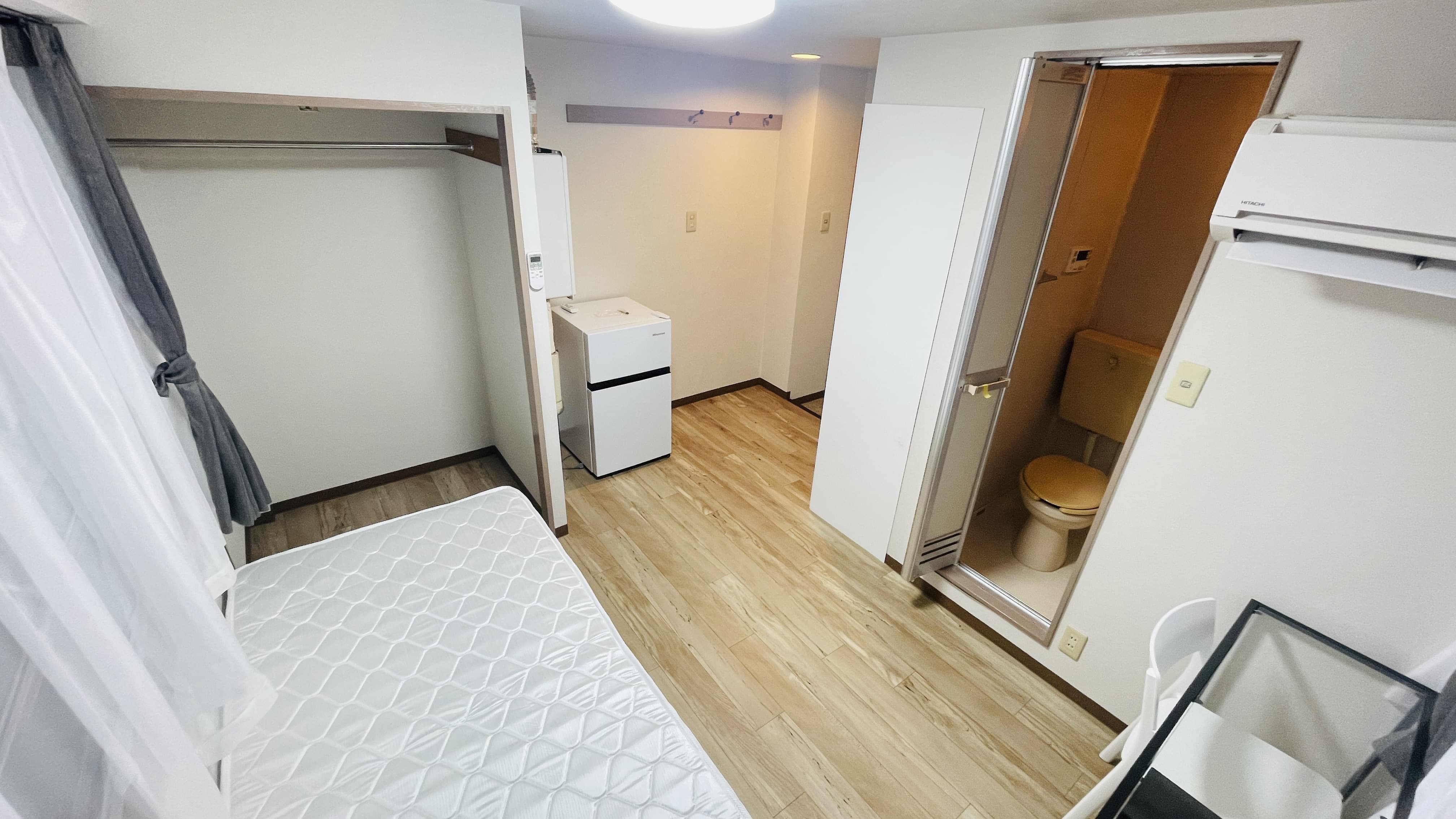 | 部屋設備 | 机、イス、照明器具、エアコン、冷蔵庫、カーテン、クローゼット,シングルベットフレーム , マットレス,キッチン,電子レンジ,3点ユニットバス |