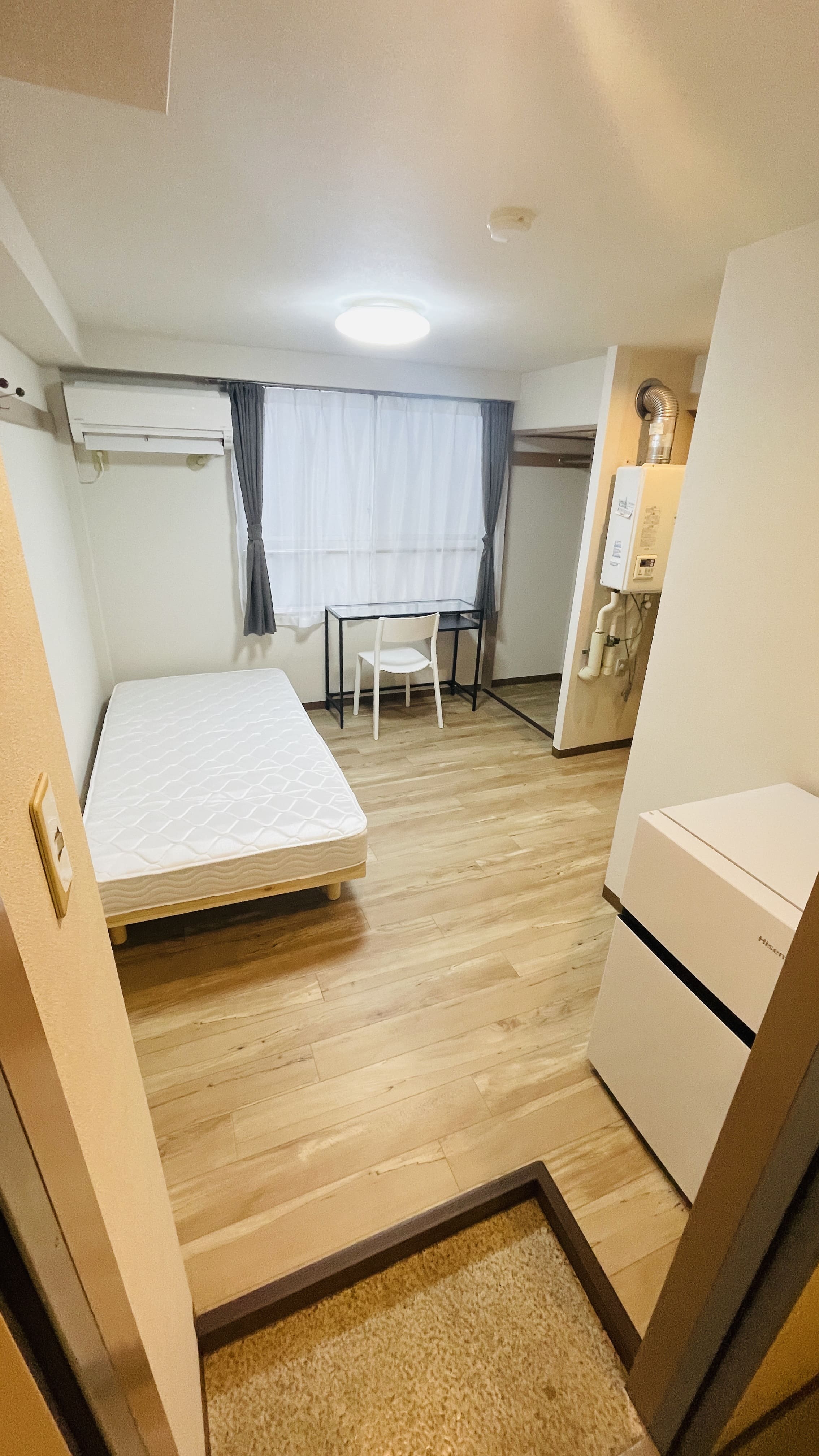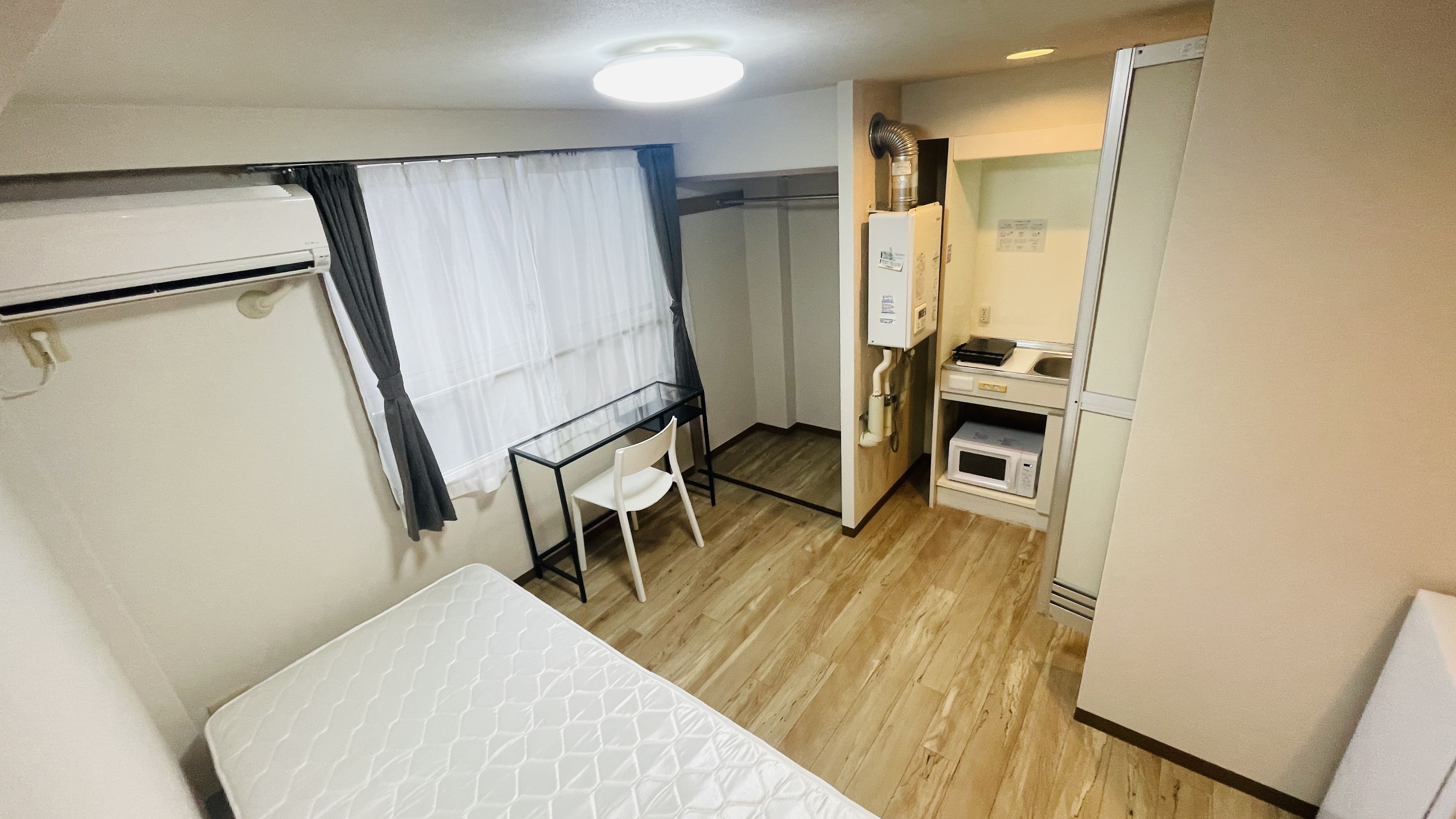 | 部屋設備 | 机、イス、照明器具、エアコン、冷蔵庫、カーテン、クローゼット,シングルベットフレーム , マットレス,キッチン,電子レンジ,3点ユニットバス |